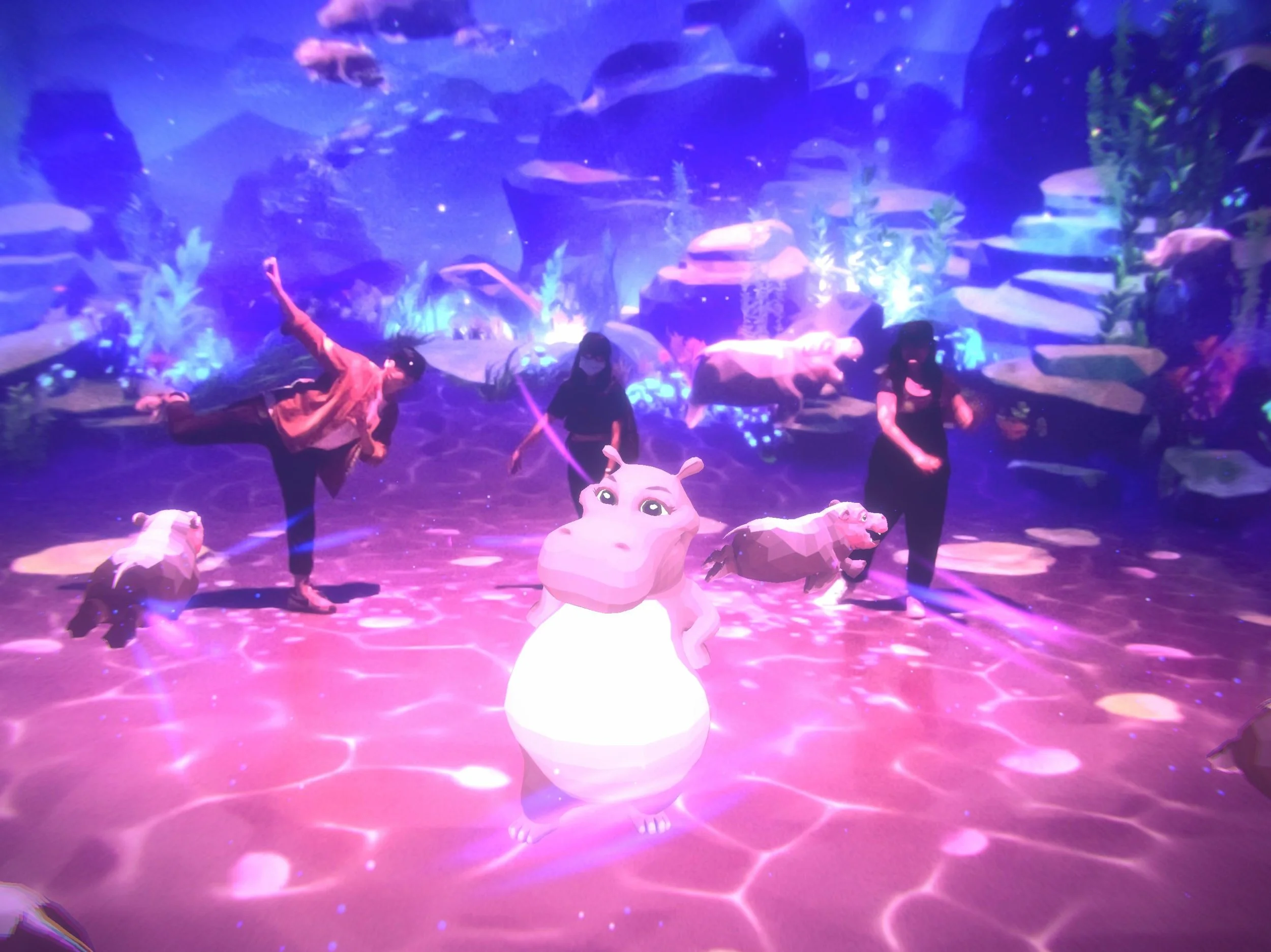 帝江化身的互動式拍打虛擬的鼓,鶴之舞是餵食虛擬的鶴,河馬圓舞曲則是讓拍打海裡的圈環,同一個時間牆上跟地上的物件也可以拍打產生變化,帝江化身是我第二次看,這次有加入旁白覺得體驗比較完整。