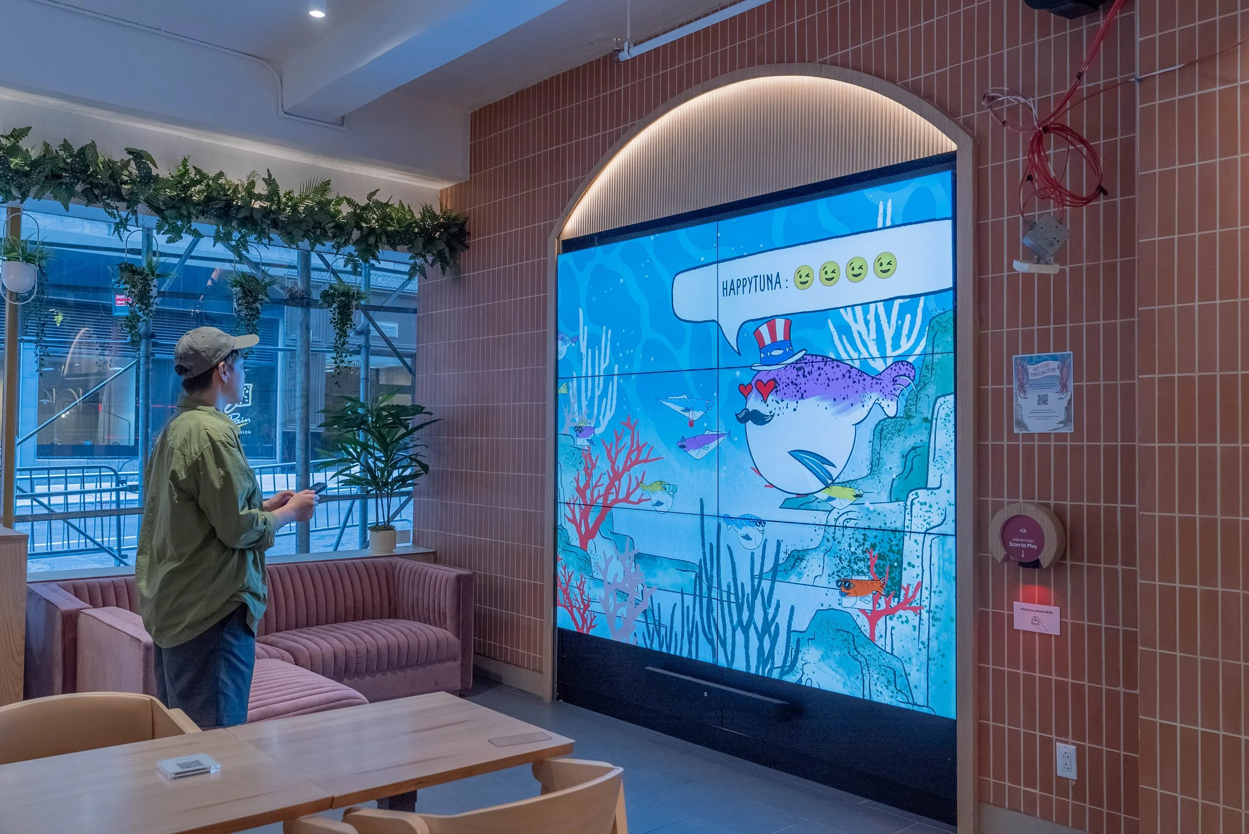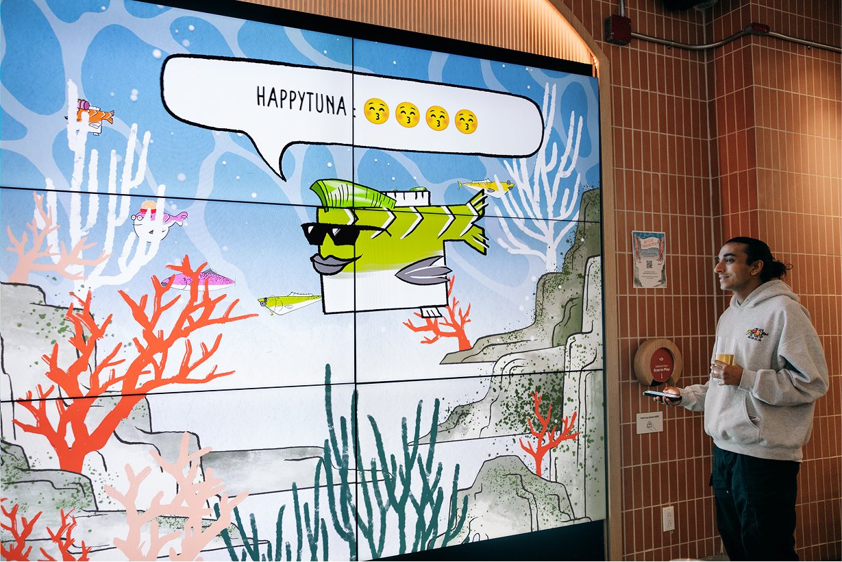 Dear Deer Studio designed and provided creative direction for the gamified digital media experience at Happy Tuna, the takeout brand’s first flagship store near Grand Central. The experience integrates a rewards program with gamification and social engagement, reinforcing the brand identity while expanding the reach of its coupon system.